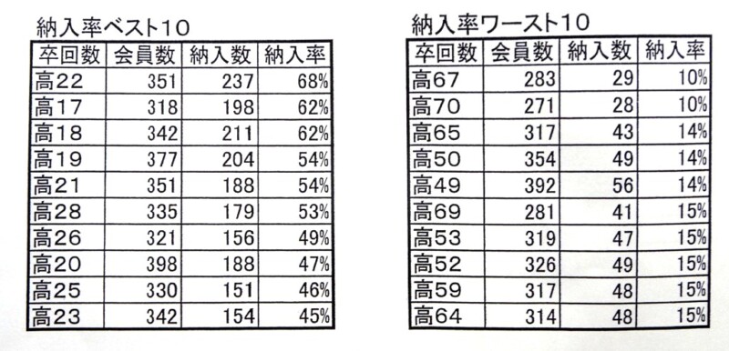 参考までに、会費の納入率ベスト10とワースト10です。