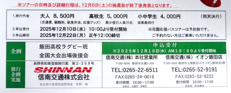 応援ツアーのバスが出ます。個人負担は昨年同様、大人一人8,500円、高校生5000円、中学生以下4000円になります。