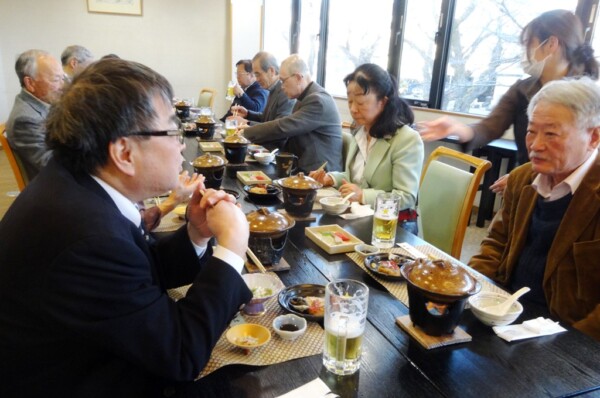 長谷川会長(高22)の音頭でカンパ~イ。お花見なら最高の部屋ですが、桜は暫く先ですね。