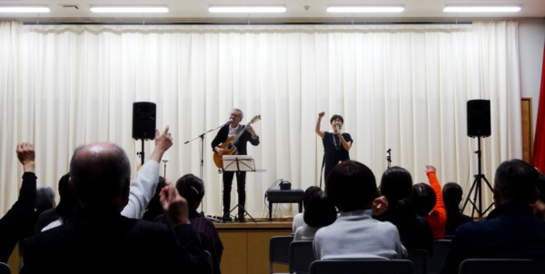市澤文化交流委員長より、文化交流イベントで、横前恭子さん(高40)と泰野さんのボーカルとギターのディオ コンサートを行いました。