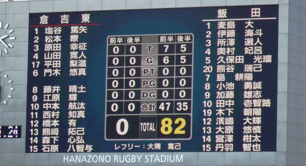 速報 ラグビー班は圧勝 View Larger Image 花園での全国高校ラグビー大会。メインスタジアムで行われました。 先ずは試合結果の速報。試合の詳細は近々アップします。 対戦相手は鳥取県代表の 県立倉吉東高校。 公立校同士の対戦で良い勝負と思われたのですが、飯田の一方的な試合となりました。 開始間もなく、飯田が先制トライ。 終わってみれば 0-82 で飯田の圧勝。82得点は長野県勢歴代2位の大量スコア。 飯田の完封勝利は、12度目の出場にして初めてでした。 次の試合は30日。2回戦の対戦相手は強豪の目黒学院です。 (HP 高田 高18回) views: 141 ホームページ委員長2025-12-29T02:18:11+09:002025年12月29日 月曜日|お知らせ|