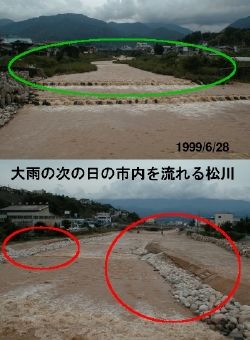 半年近くかかってほぼ完成?した市内を流れる松川の河川敷の工事。時代の親水河川ではなく、石と砂でキッチリ水路を作り上げました。が、6月末の大雨で、写真の様に、水際テーパー部分の表面の砂は削り取られ、石とそれを包む金網が露出してしまいました。上の写真は未工事の地域ですが、草木が土砂の流出を防いでいます。